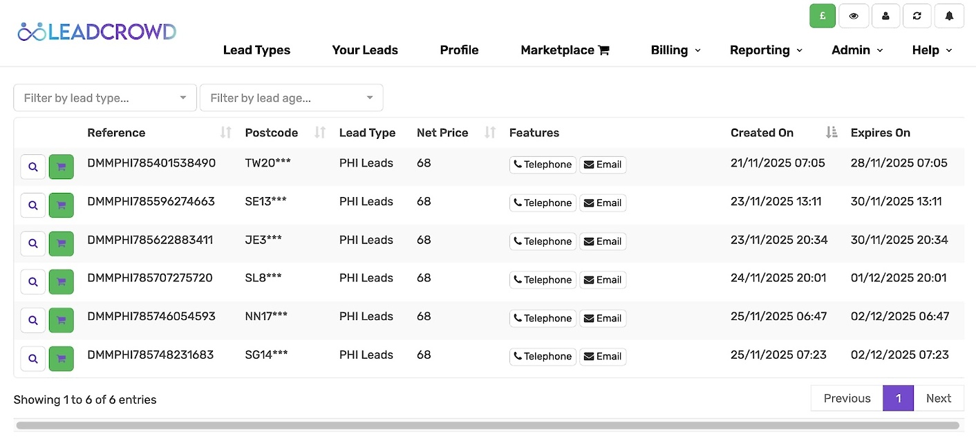 You can filter the leads by how old the enquiry is as well as lead type and postcode. All of the lead types you will find on LeadCrowd are sold on the Marketplace too.